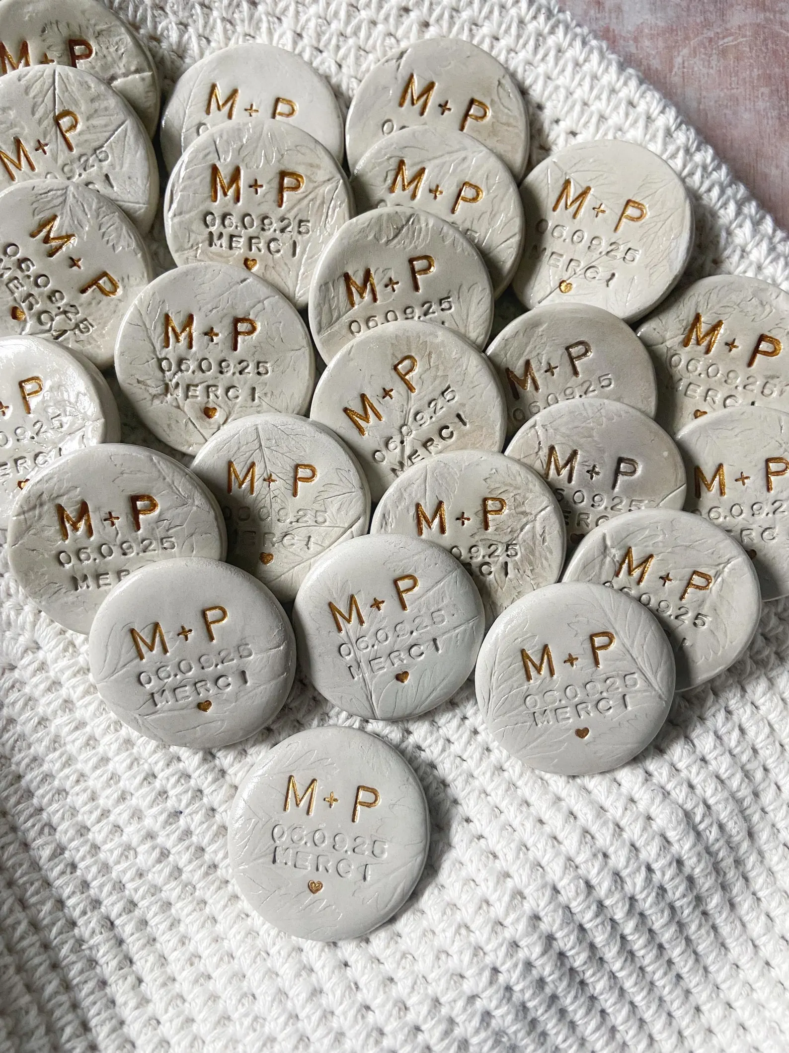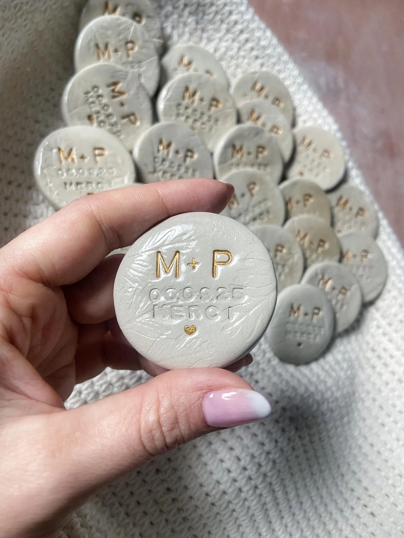 Offrez à vos proches un souvenir élégant et intemporel grâce à nos magnets en argile gravés. Idéal pour un mariage, un baptême, une communion ou tout autre évènement spécial, chaque aimant est personnalisable avec les prénoms, la date ou un message unique.